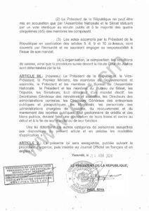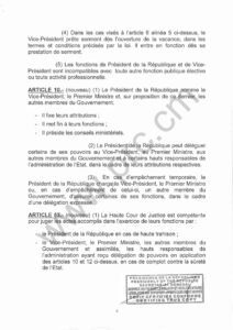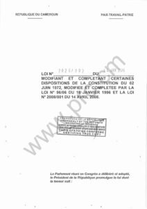 Loi modifiant et complétant certaines dispositions de la Constitution du 02 juin 1972, modifiée et complétée par la loi N°96/06 du 18 janvier 1996 et la loi N°2008/001 du 14 avril 2008. Le Président de la République peut être assisté d’un Vice-président .