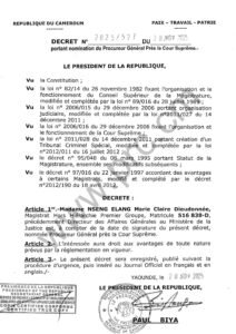 La magistrate hors hiérarchie Nseng-Elang remplace le défunt Luc Ndjodo à la Cour suprême.