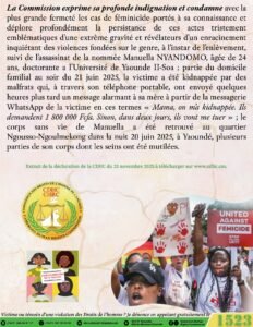 Concernant les féminicides récents, l’INDH du Cameroun s’est dite profondément indignée par le meurtre de la jeune doctorante Manuella Nyandomo, enlevée puis retrouvée mutilée à Yaoundé en juin 2025, un drame qu’elle qualifie d’illustration alarmante de l’ancrage des violences fondées sur le genre.
