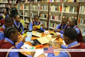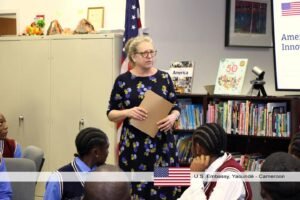 La directrice adjointe des affaires publiques, Amanda Cauldwell, a accueilli à Yaoundé 32 élèves de l’école Masters Bilingual College à l’American Center pour une session America250 célébrant l’esprit d’innovation américain.