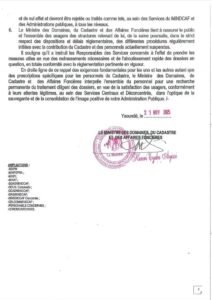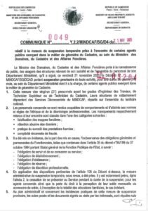 Le MINDCAF précise en outre que tout acte posé par les agents incriminés, ainsi que tout document signé ou visé par eux, est désormais considéré comme nul et sans effet. Les services du MINDCAF, ainsi que l’ensemble des administrations publiques, sont instruits de les rejeter systématiquement.